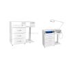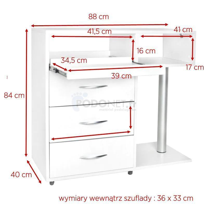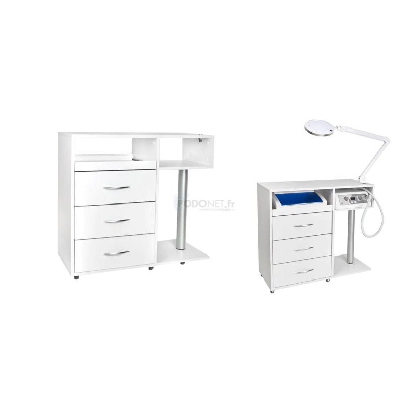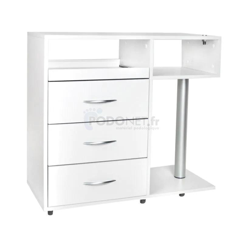 Meuble de podologie professionnel, robuste et équipé de tiroirs, dont un tiroir spécifiqueUV-C et une étagère pour un micromoteur. Un support pour la lampe loupe , complète l'ensemble. Des roulettes en métal et caoutchouc assurent sa mobilité. Ce meuble a été conçu pour faciliter le travail du praticien.