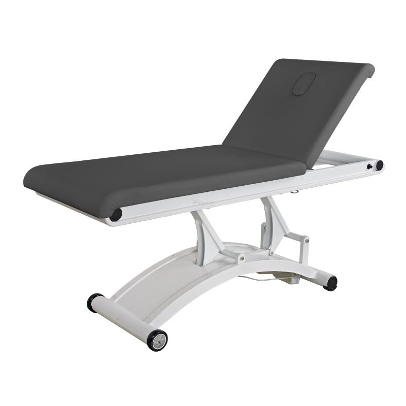 Table de massage de dessin minimaliste à 2 plans. Hauteur réglable de 53/86cm par moteur par pédale. Inclinaison du dossier, de 0 à 75°, réglable par vérin à gaz. Robuste structure métallique avec 2 roulettes pour faciliter son déplacement. Revêtement en PU de haute qualité et facile à nettoyer, épaisseur 8cm densité 25Kg/m3. Trou visage.