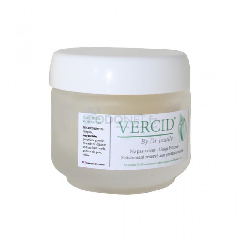 VERCID est un produit spécialement mis au point par le Dr Jouille pour le traitement professionnel de tous types de callosités et excroissances cutanées, au niveau des pieds exclusivement. VERCID n’a pas une actioyn kératolytique. VERCID contient de l’acide glycolique. C’est un Alpha-Hydroxy-Acide dont la caractéristique essentielle est sa capacité d’action au niveau des liaisons ioniques intercornéocitaires. En détruisant ces liaisons, VERCID pénètre plus facilement et plus profondément. De façon imagée, un kératolytique (ainsi que les techniques par cryothérapie) détruit violemment toutes les briques du mur cellulaire alors que VERCID ne détache que les briques à enlever sans détruire le reste du mur cellulaire.